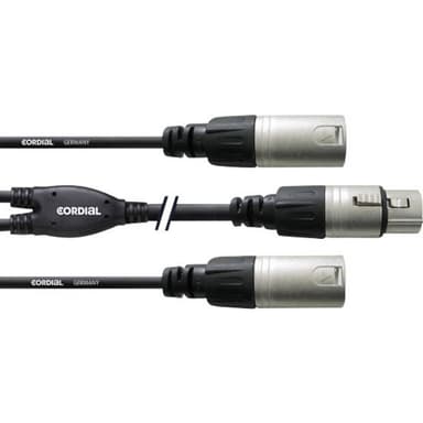 Cordial CFY0.3FMM XLR Adapterkabel [2x XLR-hankontakt - 1x XLR-honkontakt] 30.00 cm SvartKabeltyp intro cable 2 · Kabelbeläggning: FMM · kontaktdon: Rean · ledningstvärsnitt: 2 x 0,22 mm2 · längd 0,3 m.Läs mer om produkten