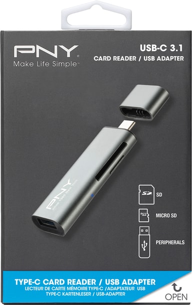 Överför data och anslut USB-utrustning till din enhet med en USB-C med PNY USB-adapter. Den är kompatibel med MicroSD-kort, SD-kort och flash discs samt möss eller skrivare.Läs mer om produkten