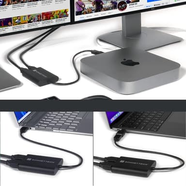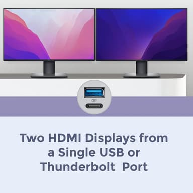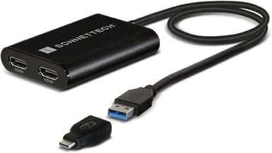 Sonnet USB-A och USB-C Dual 4K60Hz HDMI Adapter låter dig ansluta två HDMI skärmar till en dator med USB-A eller USB-C. Adaptern har stöd för två 4k60Hz monitorer och det går att både utvidga och spegla datorns skrivbord. Adaptern kräver Displaylink drivrutiner.