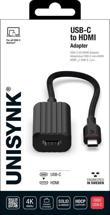 Unysink USB-C- till HDMI-adapter 10377 gör att du kan ansluta din enhet till en extern bildskärm med upp till 4K Ultra HD-upplösning vid 60 Hz. Den är inkapslad i ett hållbart aluminiumpaket med en förstärkt kabel.Läs mer om produkten