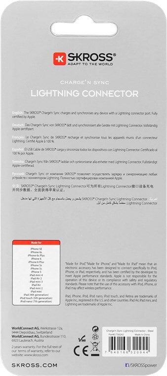 SKROSS® Charge'n Sync Lightning USB-kabel (Steel Line) ger en snabb anslutning för att ladda och synkronisera alla dina Lightning-enheter.