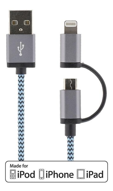 Tygklädd USB-Kabel med både lightning-kontakt och Micro USB för att kunna ladda och synka en mängd olika enheter med en och samma kabel.Läs mer om produkten