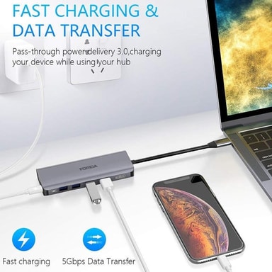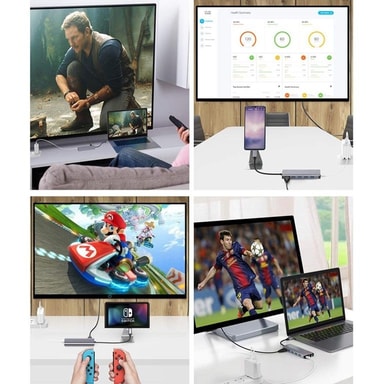 USB-C-hub med 7 uttag – 1 x HDMI, 1 x USB-A 2.0, 3 x USB-A 3.0, 1 x USB-C och 1 x RJ45. Perfekt för att utöka din laptops uttag, särskilt ifall nätverksuttaget (RJ45) saknas. USB-hubens HDMI-uttag stödjer 4K-upplösning och passar utmärkt vid koppling mellan dator och bildskärm.