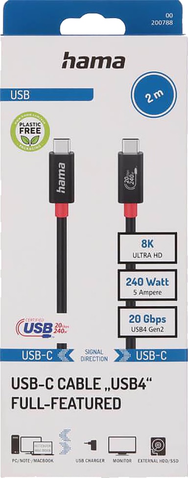 Hama USB-C 4 kabel låter dig ladda upp dina enheter direkt. Den klarar upp till 240 W effekt vilket räcker för att ladda även en strömkrävande bärbar dator. Du får även 20 Gbps överföringshastigheter för supersnabb dataöverföring.Läs mer om produkten