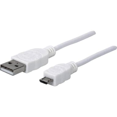 Manhattan 323987 USB 2.0 [1x USB 2.0 A hane - 1x USB 2.0 Micro-B hane] 1.00 m Vit UL-certifieradStandarder och certifikat: UL 2725, USB 2.0 Förnicklade kontakter Gjutet PVC-hölje 28 AWG Skärmad Tål: 300 V DC 10 ms Isolationsresistans: 5 MΩLäs mer om produkten