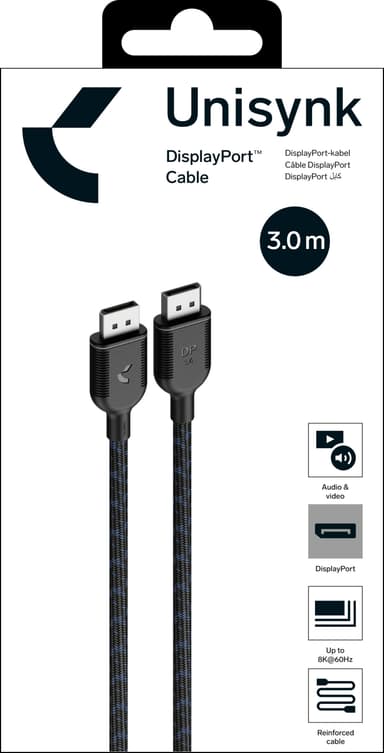 Unisynk DisplayPort 8K 10478kabeln (3 m) levererar fantastiska bilder i upp till 8K-upplösning vid 60 Hz och 4K vid 240 Hz,. Den stöder kedjekoppling och är PVC-fri.Läs mer om produkten