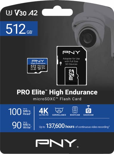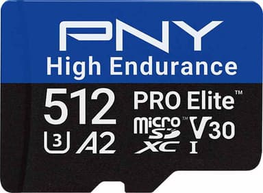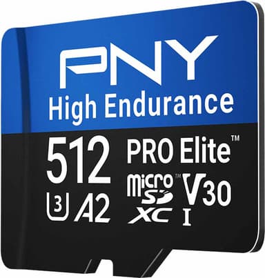 PNY PRO Elite High Endurance microSD-kort på 512 GB erbjuder snabba läs-/skrivhastigheter på upp till 100/90 MB/s. Det har klass 10, U3, V30 och A2-märkning. En SD-adapter medföljer.Läs mer om produkten