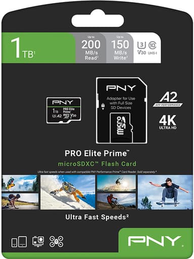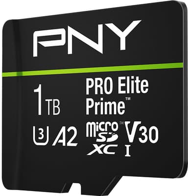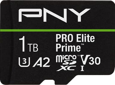 PNY PRO Elite Prime 1TB microSD-kort har läs-/skrivhastigheter upp till 200/150 MB/s, idealiskt för 4K-video och appar, med klass 10, U3, V30, A2. Inkluderar SD-adapter för kameror och laptops.Läs mer om produkten