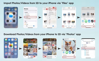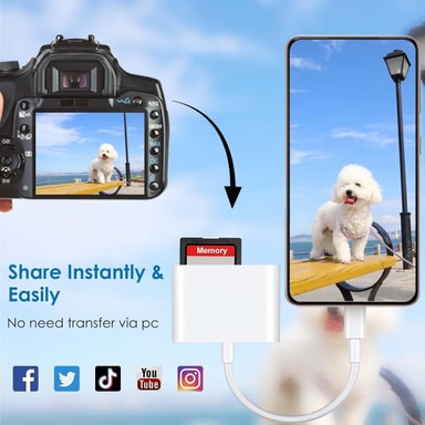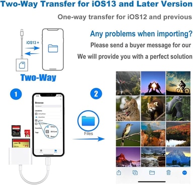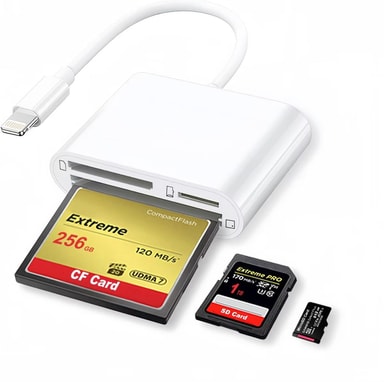 NÖRDIC Lightning kortläsare omvandlar en Lightning port i din iPhone eller iPad till en SD-kortplats, en MicroSD-kortplats och en CF minneskortplats. Minneskortplatserna har stöd för UHS-I vilket ger hastigheter upp till 104 Mbps. Produkten kräver inga drivrutiner och är kompatibel med alla iPhones från iPhone 6 och uppåt, samt alla iPads med Lightning port. Adaptern har stöd för enheter med iOS 9.2 eller högre. iOS versioner lägre än iOS 13 stöder bara överföring från minneskort till mobil/surfplatta, iOS 13 och nyare versioner stöder både överföring till och från minneskortet.Specifikationer: