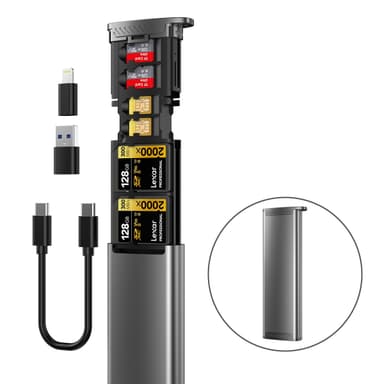 NÖRDIC minneskortläsare för lagring och läsning ansluts till en dator eller mobil via USB-A, USB-C eller Lightning och låter dig läsa och skriva på dina SD- och MicroSD-minneskort samtidigt. Du kan även lagra upp till fyra MicroSD-minneskort, tre SD-minneskort och två SIM kort i höljet.