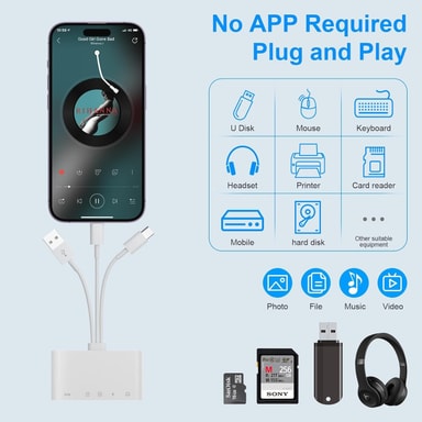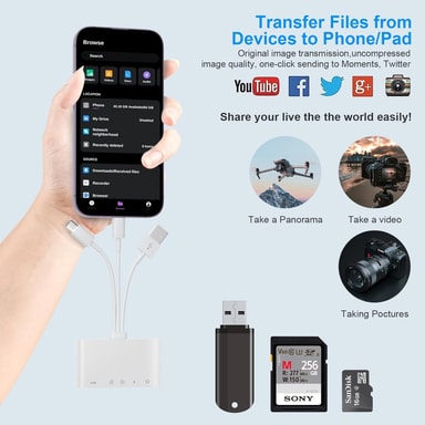 Denna multikompatibla kortläsare kan anslutas via Lightning, USB-C eller USB-A till iPhone, iPads, Android med OTG och alla möjliga datorer och kameror med USB-A. Du får tillgång till en SD-kortplats, en MicroSD-kortplats och en USB-A port, en 3,5mm ljudutgång och en Lightning port för att ladda anslutna iPhones eller iPads, OBS endast laddning via Lightning kabeln. Du kan överföra bilder, video, filer och musik från alla 3 anslutningar.
