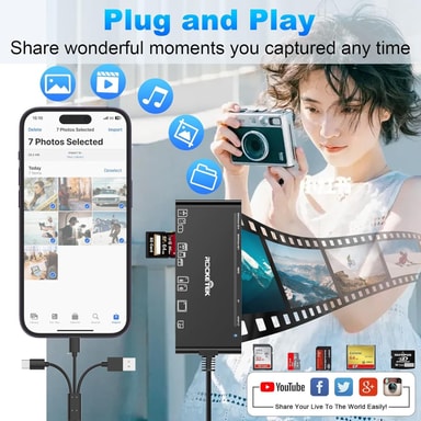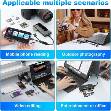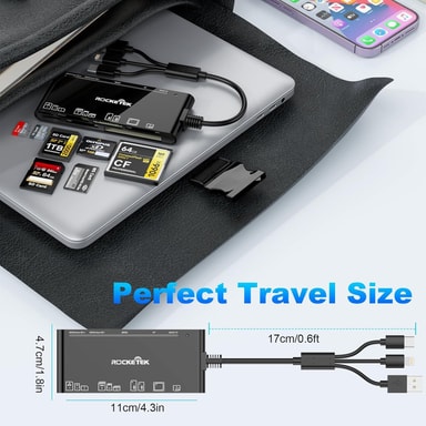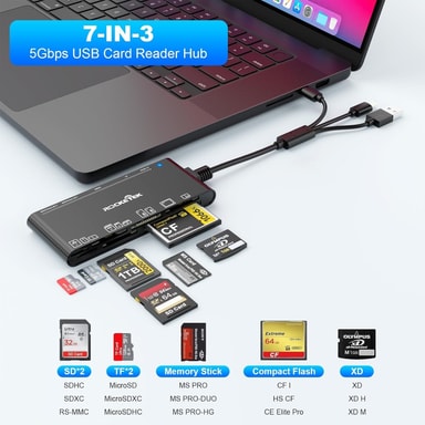 NÖRDIC Multi-Kortläsare med USB-C, USB-A och Lightning-kontakt är ett mångsidigt verktyg för att läsa och överföra data från flera olika minneskort, inklusive SD, MicroSD, CF, M2 och MS. Perfekt för fotografer, innehållsskapare och alla som vill snabbt föra över filer till dator, surfplatta eller mobil – oavsett operativsystem. Plug & Play, ingen drivrutin krävs.Specifikationer: