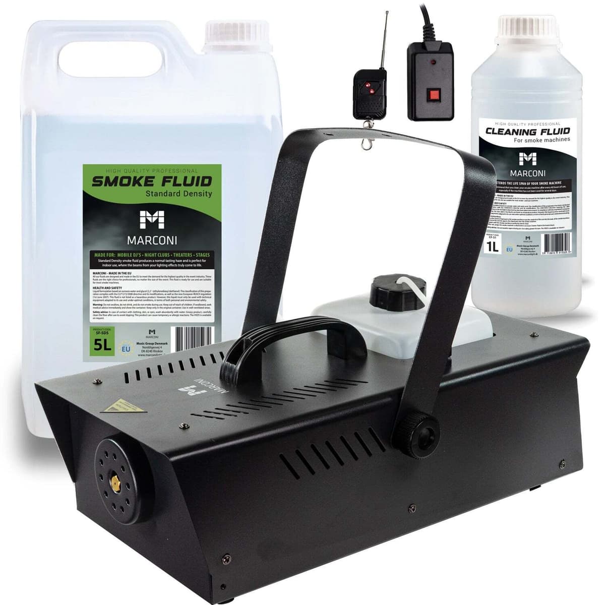 Fett Marconi Bundle bestående av 1200W rökmaskin, 5L Standard Density rökvätska och 1L rengöringsvätska