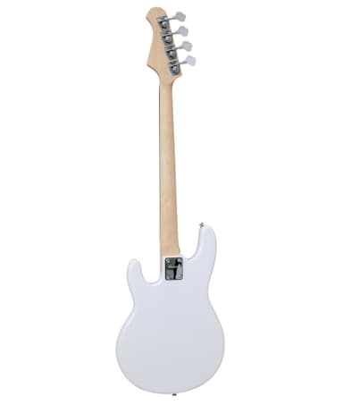 Vit högglans el-bas för nybörjare.  Byggd i äkta trä.  Bolt-on neck.  Kromade stämskruvar.  Humbucker pickups. Läs mer om produkten