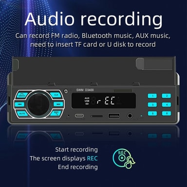 Kopieringsfunktion för ljudkälla (när en U-skiva eller TF-kort är isatt, tryck och håll in ratten i radio-, BT-musik- eller AUX-läge för att lagra den aktuella favoritljud- eller radiostationen på TF-kortet eller U-skivan för insamling, så att den kan spelas och lyssnas på nästa gång)