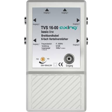 Axing TVS 16 Multi range repeater 10 dBInställbar dämpning 0 - 20 dB · Inbyggd nätenhet 230 V/50 Hz, anslutningar: 1 x IEC-koppling, 6 x IEC-kontakt.Frekvensområde 47 - 862 MHz · 6 x 10 dB förstärkning · Inställbar dämpning 0 - 20 dB · För små BK-Läs mer om produkten