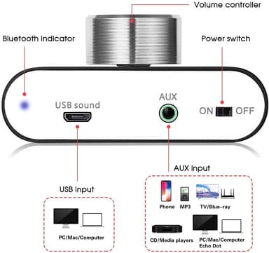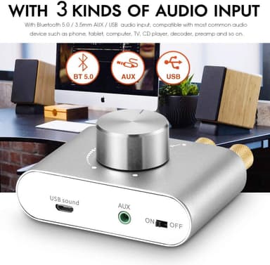 Med Bluetooth Audio förstärkare kan du trådlöst streama ljud med Bluetooth 5.0, upp till 20m. Med en stabil och snabb trådlös ljudöverföring minskar även risken för interferens och förlust av ljud. En perfekt lösning för dig som vill förvandla dina vanliga högtalare till Bluetooth-högtalare. Utöver Bluetooth går det att koppla PC eller bärbar via USB porten, eller koppla smartphone, MP3, DVD spelare m.m via AUX.
