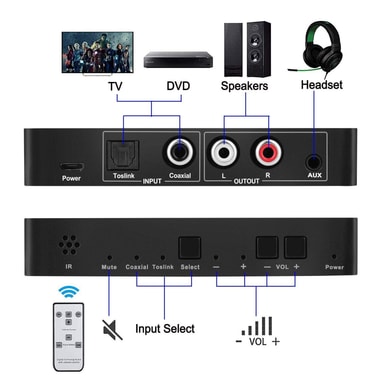 NÖRDIC SGM-108 konverterar digitala ljudsignaler från koaxial eller Toslink till analog L / R-ljud och är tillgängliga för anslutning till en extern enhet, till exempel en förstärkare via vanliga RCA-stiluttag. Det finns även 3,5mm stereo utgång för hörlur. Drivs av USB laddare (ingår ej). USB kabel ingår.