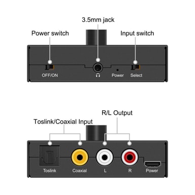 NÖRDIC SGM-126 konverterar digitala ljudsignaler från koaxial eller Toslink till analog L / R-ljud och är tillgängliga för anslutning till en extern enhet, till exempel en förstärkare via vanliga RCA-stiluttag. produkten har utgång för 3,5mm headset eller hörlur. USB kabel för strömförsjörning ingår som kan kopplas till en USB laddare 5V 1A.