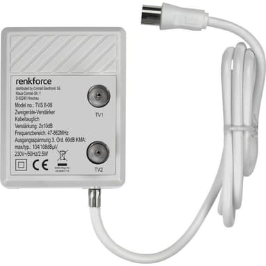 Renkforce Kabel-TV förstärkare 10 dB1 ingång, 2 utgångar · Fast ansluten kabel ca 95 cm · Maximal utgångsnivå 103 dBµV · Kabelnätkompatibel · Inbyggd nätenhet 230 V · Effektförbrukning: 2,5 W · Plasthölje · HF-tät1 ingång, 2 utgångar · FörstärkningLäs mer om produkten