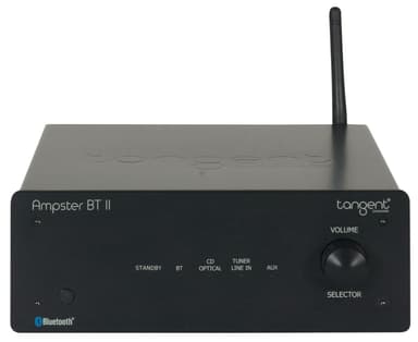 Bra ljud förtjänar en bra förstärkare. Med den andra generationen av den prisvinnande Tangent Ampster BT-förstärkare får du en liten kompakt förstärkare med en mängd av användarmöjligheter. Kombinera dinTangent Ampster BT II-förstärkare med högtalare av god kvalitet, till exempel Tangent Spektrum X4 eller X5. Då får du ett optimalt ljud. Du kan dessutom streama din musik direkt till förstärkaren antingen trådlöst via blåtand eller genom att koppla in din enhet med hjälp av AUX-kabel. Det finns naturligtvis också digital ingång, analog Line-ingång, Sub ut och USB-laddnigsport. Väckning via Blåtand och redo för multirum Nu behöver du inte heller bekymra dig om att släcka din förstärkare. Den går själv i standby, när du spelar upp musik via båtand och musiken slutar spela. Den startar automatiskt när den känner av signalen från din blåtandsenhet. Den kan även väckas via AUX-minijack-ingången. Därigenom kan du ansluta de flesta multiroom- eller nätverkssystem. Sätt t.ex en Cromecast Audio, Airport Express eller andra enheter till AUX-ingången så lommer Tangent Ampster BT II sjäv att gå igång. Så fort du börjar spela via ditt nätverk. Stort ljud behöver inte så stor plats Den nya Tangent Ampster BT II passar perfekt in i Tangents mini system. Placerar du den samman med Tangents Tuner II och CD II, får du en komplett HI-FI anläggning med överaskande stort ljud. På hyllan fyller Ampster BT II, Tuner II och CD II tillsammans mindre än ett A-4 ark på den korta sidan. Varje del fyller bara 7 cm på höjben, så staplat tillsammans blir det bara 21 cm. Den lilla storleken på varje komponent gör det enkelt att hitta en plats till anläggningen i vardqgsrummet, köket eller där det passar dig bäst. En fjärrkontroll till det hela Fjärrkontrollen till Ampster BT II passar också till Tuner II och CD II. Så har du köpt alla tre del-komponter så står du faktiskt med tre likadan fjärrkontoller till anäggningen. Dessa kan du placera på stragiska platser i rummet så att aldrig kommer att befinna dig långt iväg från fjärrkontrollen. Eller så kan du välja att bara använda den ena fjärrkontrollen och lägga de andra tvåi en låda och ta fram i nödfall. Tangent Ampster BT II har dessutom i sin andra generation tillfogat en ingång till IR öga, så att man kan gömma undan anläggningen på ställen där man normalt sett inte kan använda fjärrkontrollen. Det krävs bara att man ansluter det medföljande IR ögat på ett ställe man kan nå med fjärrkontrollen och drar ledningen till ingången på baksidan på produkten.