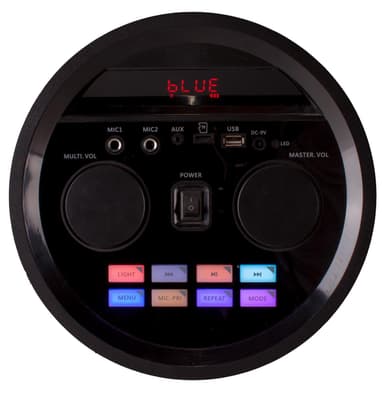 Andra funktioner: RMS Power 40W Högtalarstorlek +impedans 6,5 S/N -förhållande ≥80dB USB MP3 MicroSD/TF MP3 Effektingång DC 9V/1,5A 2 x MIC IN Powerbank -funktion MP3 -uppspelning via usb Max 32GB MP3 -uppspelning via MicroSD Max 32GB RGB Disco led -belysning Kabelmikrofon ingår Ljudingång / AUX IN