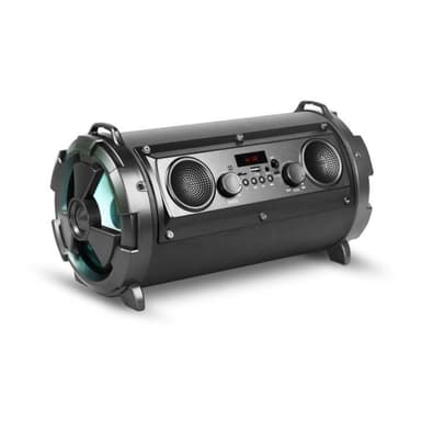 Det inbyggda uppladdningsbara batteriet med en kapacitet på 1500 mAh gör att du kan spela musik upp till 8 timmar i sträck. Den kompakta storleken och bälteshållaren gör det enkelt att transportera och förvara. Enheten är utrustad med en LED-display och lysdioder som lyser till musikens rytm, den går även att inaktivera. Man kan även styra enheten med en smartphone.