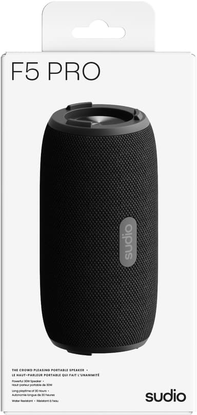 Sudio F5 Pro trådlösa bärbara högtalare ger dig en bättre ljudupplevelse med sömlös streaming och kraftfull bas. Den har kraftfulla 30 W-högtalare, IPX5-klassning och en speltid på upp till 30 timmar.Läs mer om produkten
