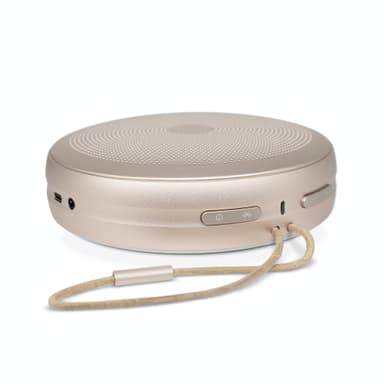 Högtalaren levereras med ett praktiskt strömuttag så att du kan använda den vart du än går (USA, Storbritannien, EU AUS). Laddningen sker via USB-C-porten på den sida där du också hittar bekvämt placerade kontrollknappar.