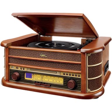 Dual NR 4 USB-skivspelare Remdrift TräStereohögtalare · Slider-CD-spelare med slumpfunktion, programmering och upprepningsfunktion · Kassettdäck på sidan · Skivspelare med automatisk tonarmsåterföring · Remdrift · Inbyggt keramiksystem · LCD-skärmLäs mer om produkten