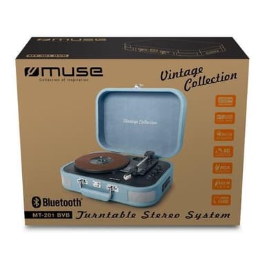 Muse MT-201 familjen fås i olika färger. Den bärbara skivtallriken har två högtalare inbyggda i höljet. Den har Bluetooth. Skivtallriken har tre olika hastigheter: 33/45/78 varv per minut.Läs mer om produkten