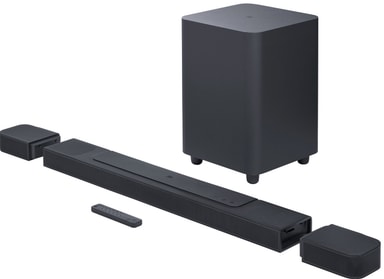 JBL Bar 1000 7.1.4ch soundbar ger dig hela 880W äkta surroundljud hemma. Soundbaren har 2 löstagbara surroundhögtalare, trådlös subwoofer och revolutionerande True Dolby Atmos för en bredare ljudbild.Läs mer om produkten