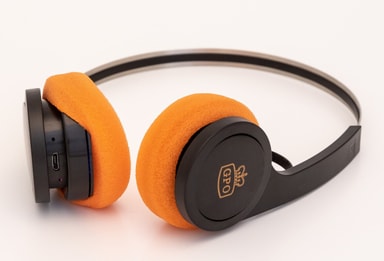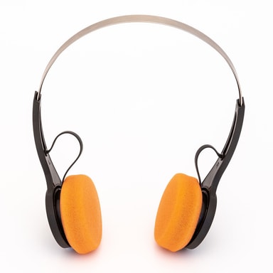 Coola retrohörlurar med orange skumkuddar.  Anslut till din smartphone för att lyssna på musik och ta emot samtal.  Inbyggd mikrofon. Läs mer om produkten