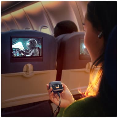 Smart Charging Case™ förvandlas till en dongel för att överföra ljud trådlöst till hörlurarna från valfri AUX- eller USB-C-källa, t.ex. underhållningssystem på TV, gym eller flygplan. Använd bara en av de två medföljande ljudkablarna för att ansluta och njut. Eller använd Auracast™-knappen på skärmen för att dela ditt innehåll till närliggande enheter genom att ansluta enheten via Tour Pro 3 Smart Charging Case™.