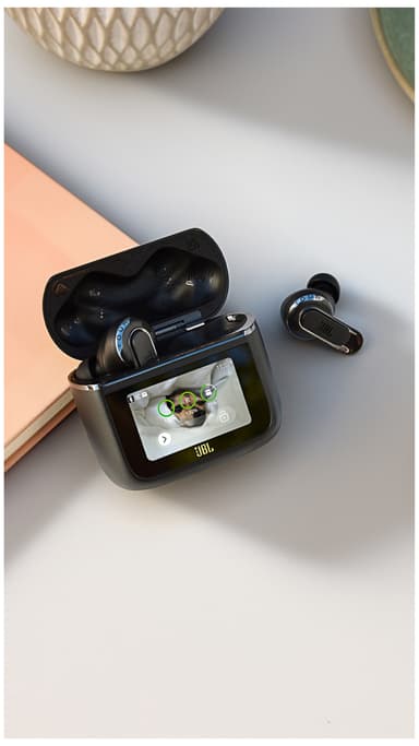 Lämna telefonen i fickan. JBL Tour Pro 3 med nydesignade Smart Charging Case™ har alla funktioner du behöver för att kontrollera och anpassa din lyssningsupplevelse och hörlurarnas inställningar, direkt från fodralet. Använd den större, tydligare 1,57-tums pekskärmen för att se vilken låt som spelas eller vem som ringer dig, eller anpassa den precisa skärmen med ditt favoritfoto. Få direkt åtkomst till ditt Spotify-konto, kontrollera tiden eller ställ in ett larm.