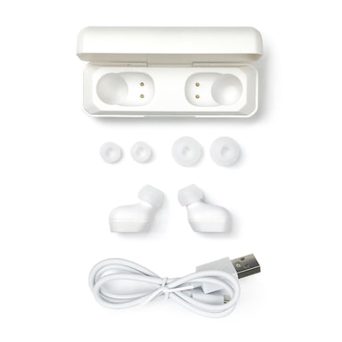 Trådlösa in ear hörlurar.  Ljudet är utmärkt, med djup bas.  Silikonhylsan är anti-perspiratorisk.  Öronproppar i följande storlekar ingår: S / M / L.  Laddstation inkluderad (laddningstid 15 min)  Mikrofon ...Läs mer om produkten