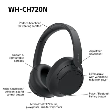 Med V1-processorn från Sonys prisbelönta WH-1000XM5 dämpar WH-CH720N omgivande ljud.