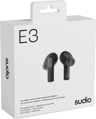 Tack vare Sudio E3 true wireless in-ear-hörlurar kan du njuta av din favoritlåt utan störningar utifrån. Med hybrid ANC, 10 mm dynamiska element, en mikrofon med bra röstklarhet och upp till 5,5 timmars lyssningstid på en enda laddning.Läs mer om produkten