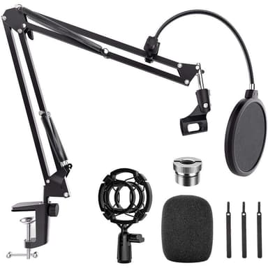 Innehåll: Stativ, mikrofonhållare, shock mount, pop filter, adapter, vindskydd skum ch buntband