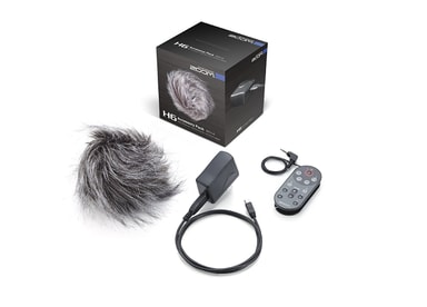Förpackning med fjärrkontroll, vindruta och nätadapter (USB-typ) för Zooms H6-inspelare.Läs mer om produkten