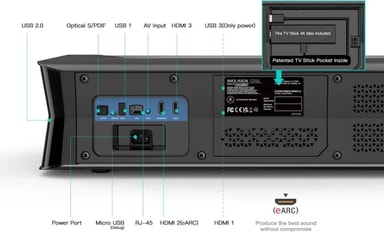 Specifikationer: - Upplösning: 3840 x 2160 (4K UHD) - Ljusstyrka: 2 000 lumen ISO - Kontrast: 2 500:1 - Bildstorlek: 80''–150'' - Projektionsavstånd: 44–83 cm - Färgomfång: 107 % BT.2020 - Input lag: 8 ms (1080p@120Hz), 15 ms (4K@60Hz) - Ljud: 2 högtalare, 36 W, Dolby Atmos, DTS Virtual:X - Anslutningar: 3x HDMI 2.1 (1 eARC), 2x USB, Ethernet, AV, optisk - OS: Android 9.0 + Fire TV, röststyrning med Alexa/Google - Mått: 599 x 145 x 353 mm, Vikt: 10,8 kg""