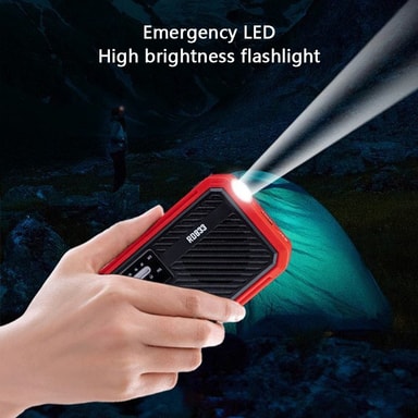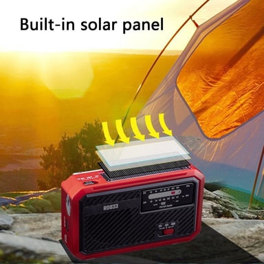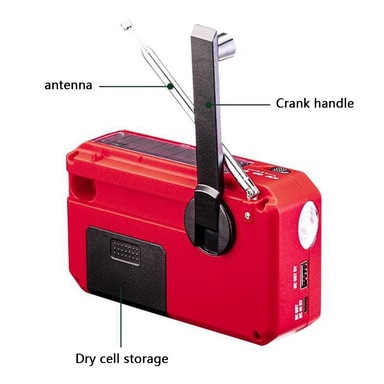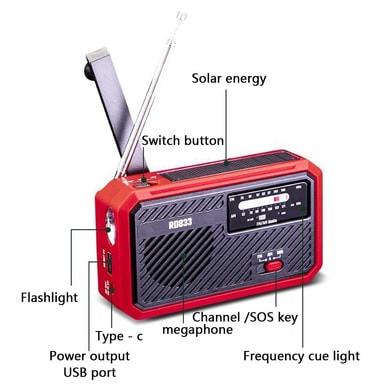 Radion kan ta emot AM- och FM-signaler. Det är enkelt att ladda den genom solenergi, manuell vev och laddningskabel, vilket eliminerar oro för strömavbrott.