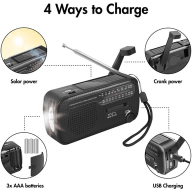 Inbyggt uppladdningsbart batteri som kan laddas med solpanel, handvev, via USB-port eller så kan radion/ficklampan drivas med hjälp av 3 AAA-batterier.