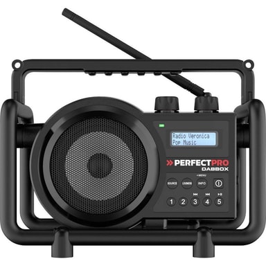 PerfectPro DABBOX Byggarbetsradio DAB+, FM AUX, Bluetooth, DAB+, FM Stötsäker SvartDAB+ digitalradio-mottagning · FM-mottagning med RDS-sändarinformation · 5 kanalminnen för FM och DAB+ · Bluetooth-mottagare för musikstreaming · Aux-ingång för externLäs mer om produkten