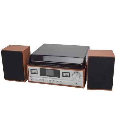 Vinyl-spelare, Radio och CD. Streama musik från mobil via Bluetooth. Fräcka VU-mätare på framsidan. Hörlursuttag och AUX-ingång. Fjärrkontroll ingår liksom högtalare.