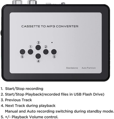 Spela automatiskt in 2-sidiga musikspår till USB-minnet från bandet. Med autoläget kommer denna kassettomvandlare att spara varje ""låt"" eller varje mening i ljudboken till en separat MP3-fil. Eller så kan du använda manuellt läge som standard och det sparas i en fil bara när du stoppar det