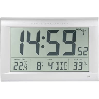 RADIOSTYRT VÄGGUR JUMBOMed visning av inomhustemperatur och luftfuktighet · Veckodagsvisning på 8 språkLäs mer om produkten