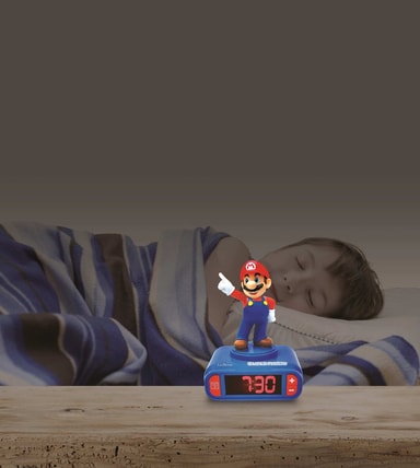 Super Mario Alarm Clock med Mario 3D-figur och ljud från videospeletLäs mer om produkten