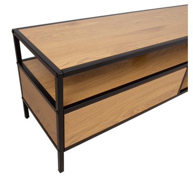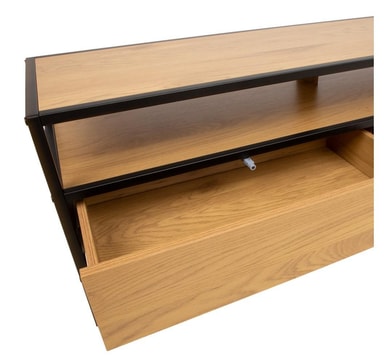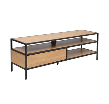 TV-bord HEDVIG 120x33xH40cm, ask/svart. Bordsskiva, hyllor och låda: melaminskiva med askdekor. Bordets ben och stomme är gjorda av metall och avslutade med svart pulverlack.