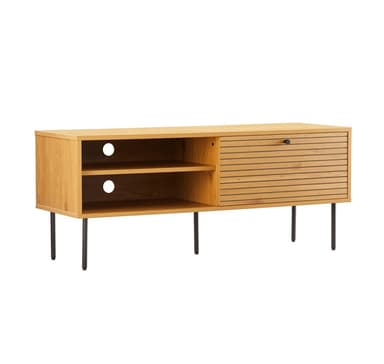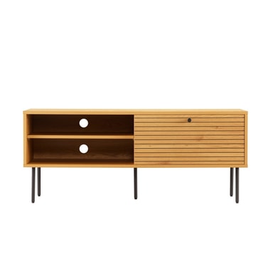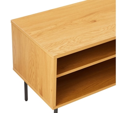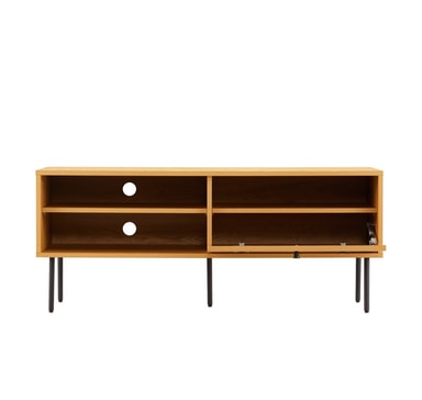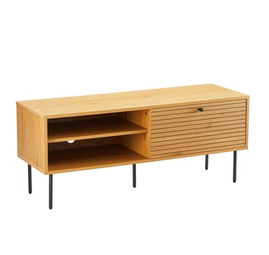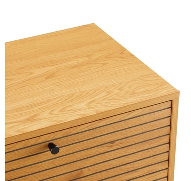 TV-bord LINE med låda och hyllplan 120x40xH50cm. TV-bordet är tillverkat av melaminskiva med ekbark. Den randiga lådfronten med präglad yta är gjord av svart MDF-skiva, och dekorerad med smala ekfärgade lameller. Bordets metallben är avslutade med en svart pulverlackering.